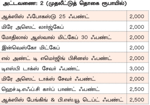 கார்ப் பாண்ட் ஃபண்ட் ரூ.1,000, டி.எஸ்.பி டாக்ஸ் சேவர் ஃபண்ட் ரூ.3,000, டாடா