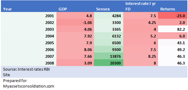 It clearly shows when the interest rates fall, it helps economy to grow which in turn helps company to post decent profits, the by-product market to move up. Table will help you to understand in detail.